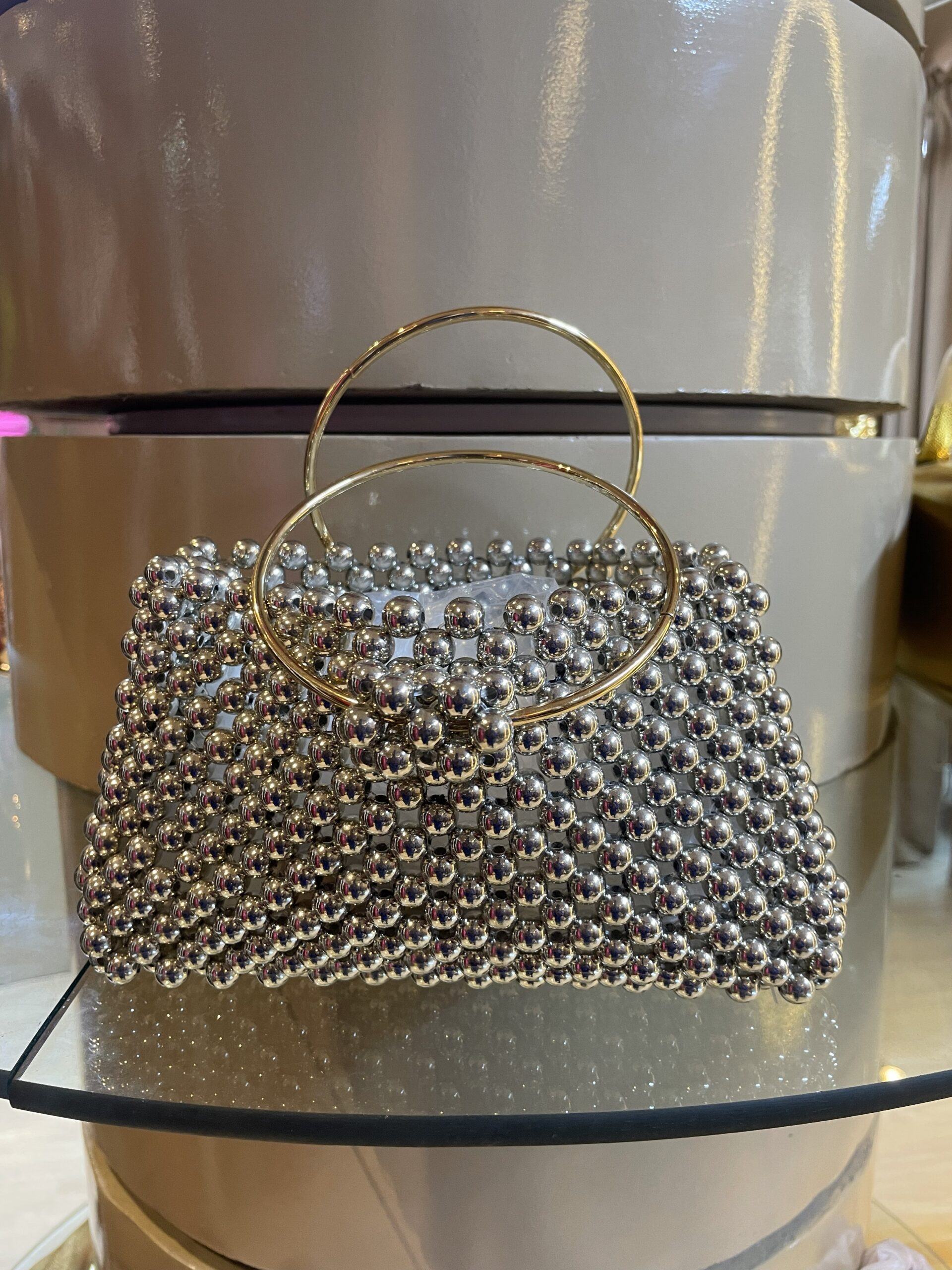Make an unforgettable entrance with this extraordinary handcrafted evening clutch entirely covered in gleaming metallic silver ball beads. This show-stopping accessory is a true work of art, featuring hundreds of precisely arranged spherical beads that create a mesmerizing, three-dimensional texture.